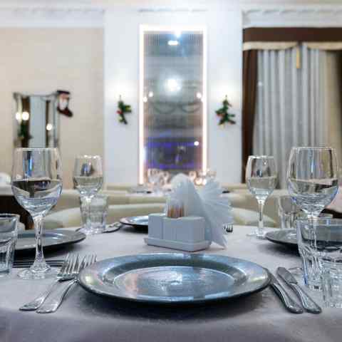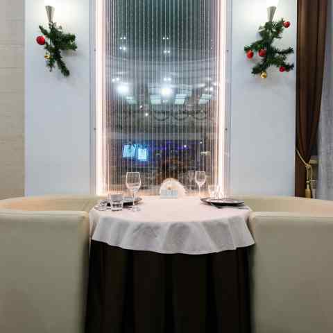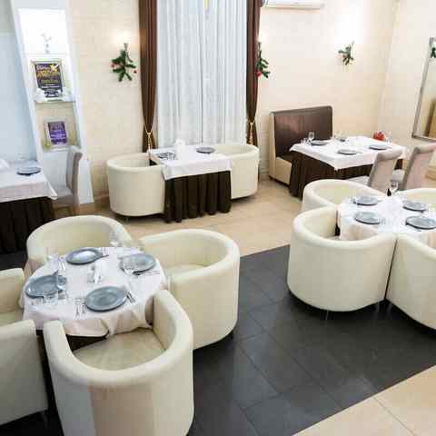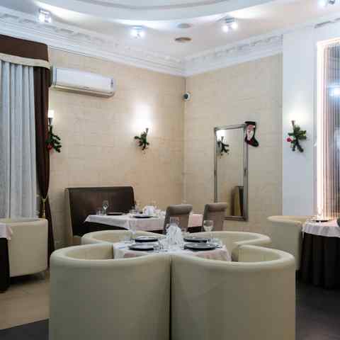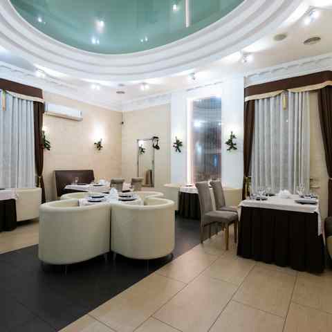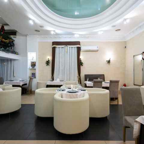 Интерьер ресторана оформлен в стиле изысканной классики, приятные бежево-молочные и светло-мраморные тона радуют глаз и добавляют света и тепла помещению. Стильные детали оформления прекрасно гармонируют с общей атмосферой ресторана и дополняют его нотками элегантности и утонченности.
