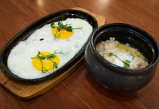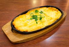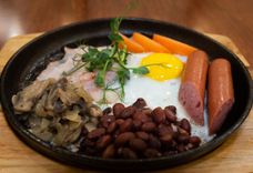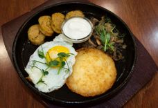 400 г • горячая сковородка со свиной шеей, картофелем, грибами и яйцом, подается со сметаной